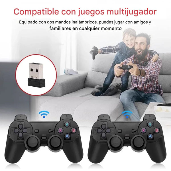 Su salida 4K HD ofrece una experiencia visual más nítida y envolvente, dándole nueva vida a los recuerdos de tu infancia. Incluye dos mandos inalámbricos de 2,4G, ideales para compartir risas y competiciones con amigos o familia, como en aquellos días en que las tardes parecían interminables.